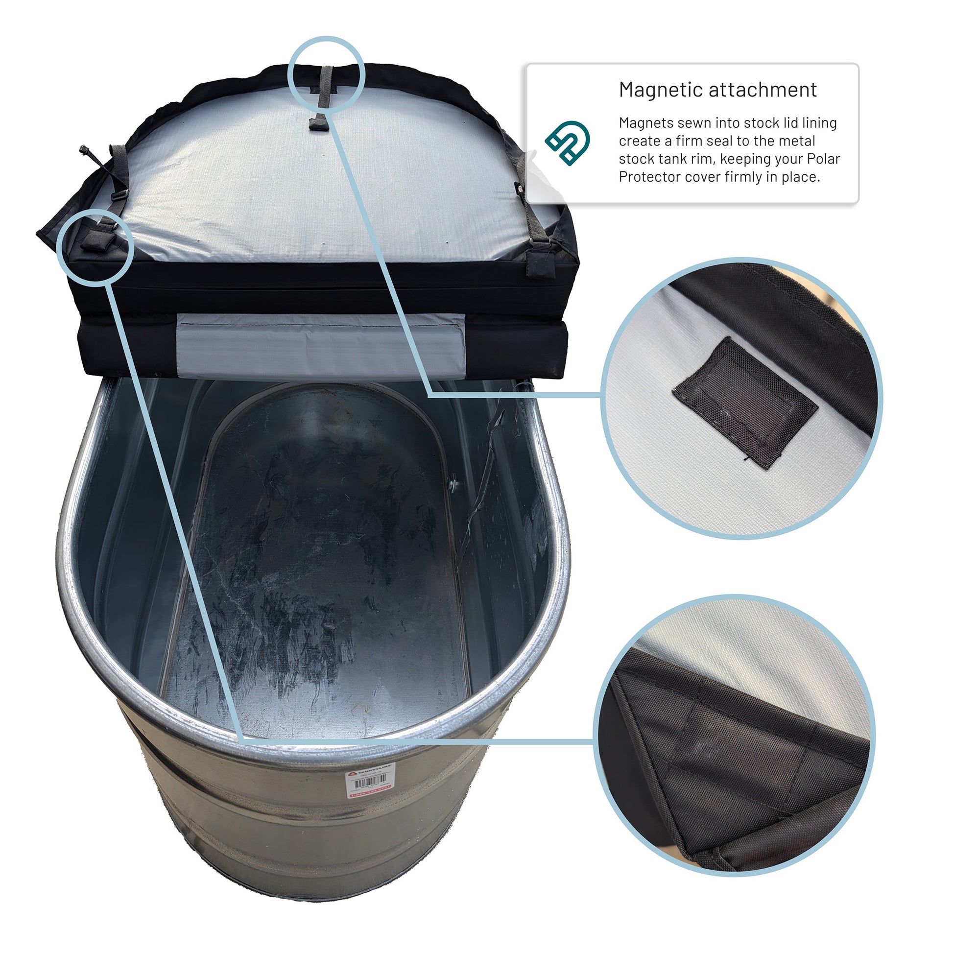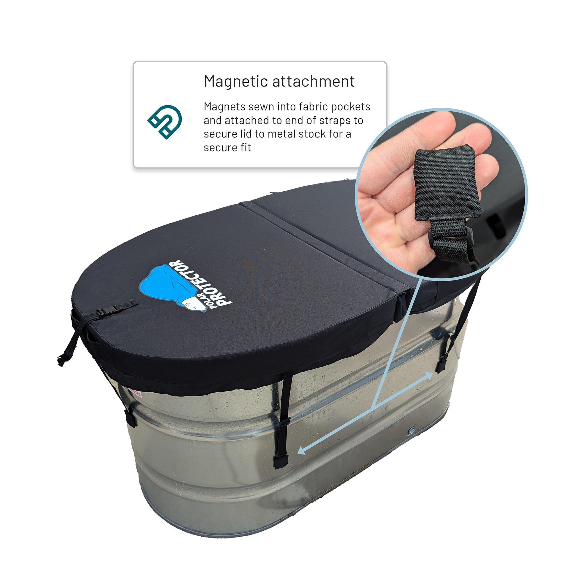 Secure Attachment System: Featuring a 6-point attachment system with magnetic attachment, our hard cover offers a secure and stable fit for your stock tank. This innovative design not only prevents heat exchange but also ensures that the cover stays firmly in place, even in windy conditions. Enjoy peace of mind knowing that your stock tank is fully protected and insulated against external elements. A skirt is also included to ensure you have a solid seal around your stock tank. Magnets are also placed on the inside bottom portion of the cover to sit on-top of the metal tank and attach.